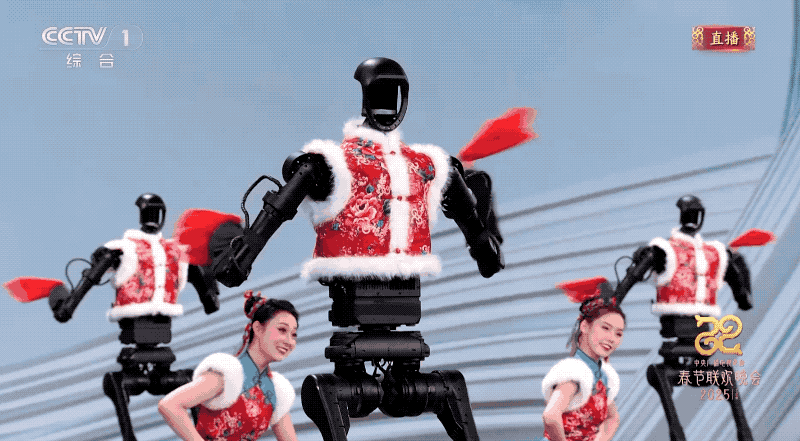 △在2025年总台央视春晚上,宇树科技的16个人形机器人与16名舞蹈演员协同共舞。