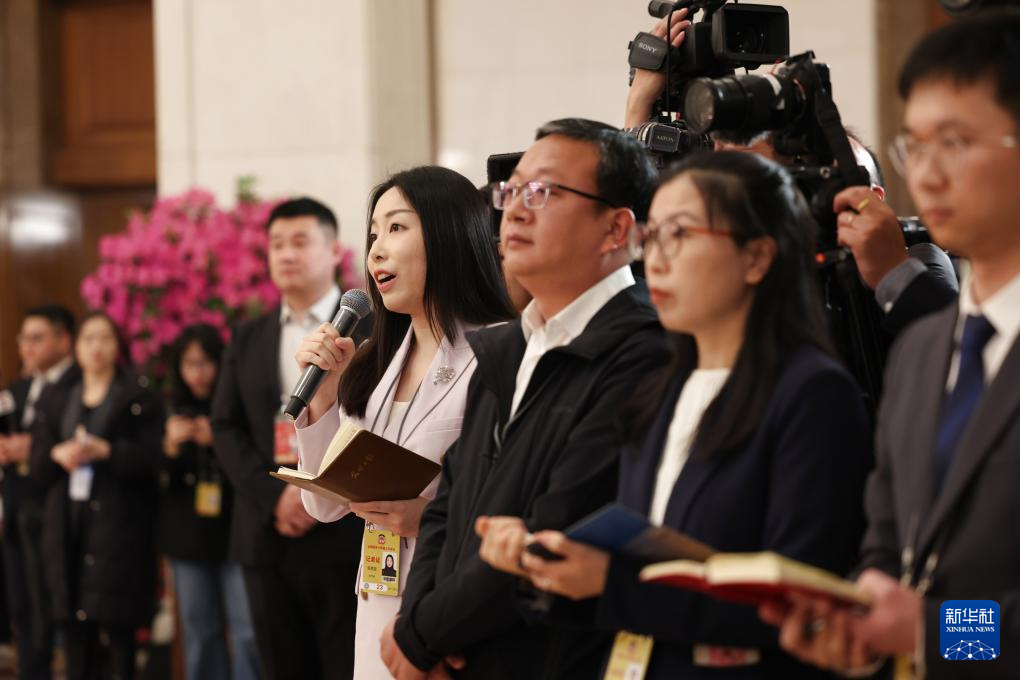 3月4日,全国政协十四届三次会议首场“委员通道”集体采访活动在北京人民大会堂举行。这是记者在提问。新华社记者 殷刚 摄