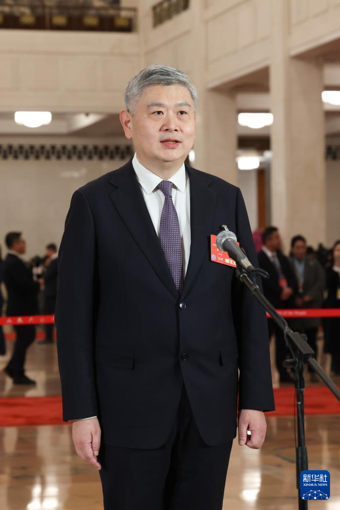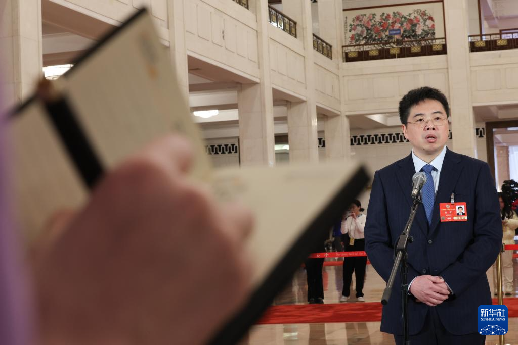 3月4日,全国政协十四届三次会议首场“委员通道”集体采访活动在北京人民大会堂举行。这是全国政协委员严建兵接受媒体采访。新华社记者 张玉薇 摄