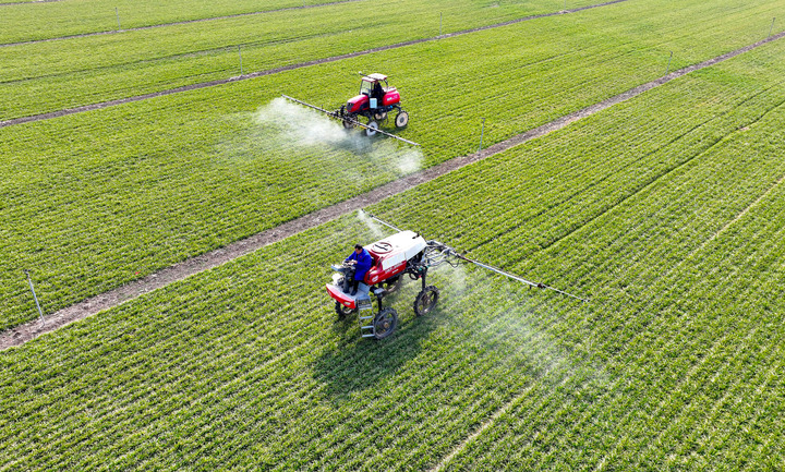 2025年2月18日,在安徽省亳州市谯城区赵桥乡一处麦田,农民驾驶农机开展田间管理(无人机照片)。新华社发(刘勤利 摄)