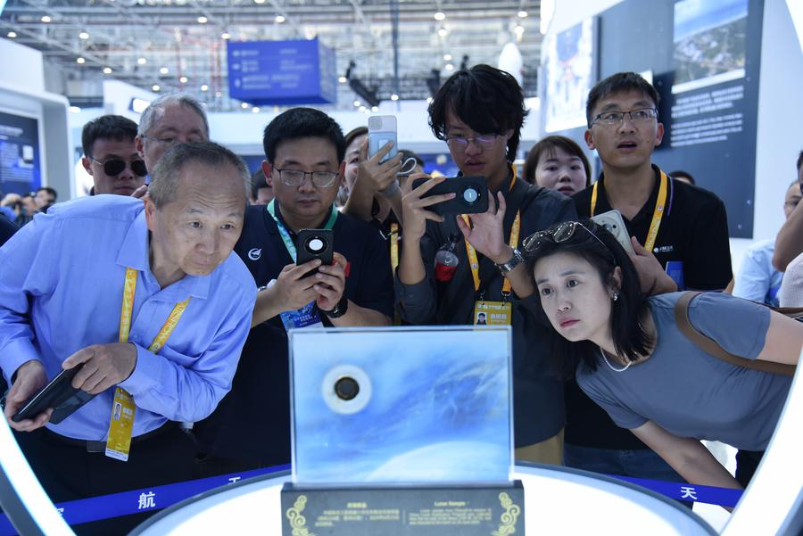 2024年11月12日,在珠海举行的第十五届中国国际航空航天博览会上,观众近距离观察拍摄嫦娥六号取自月球背面的土壤样品。新华社记者 洪泽华 摄
