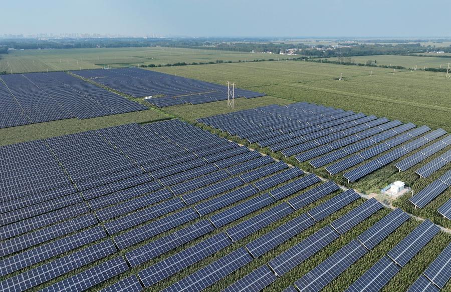 2024年8月21日拍摄的河北省衡水市冀州区冀州镇附近的“农光互补”光伏发电场(无人机照片)。新华社记者 杨世尧 摄