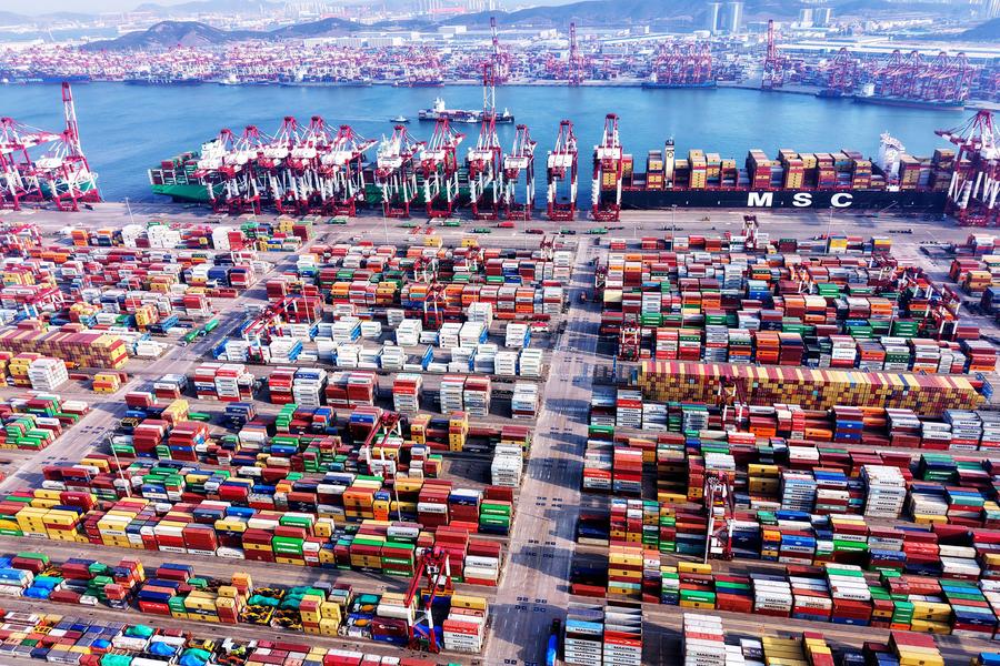 这是2025年2月23日拍摄的山东港口青岛港外贸集装箱码头(无人机照片)。新华社发(俞方平 摄)