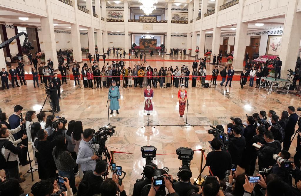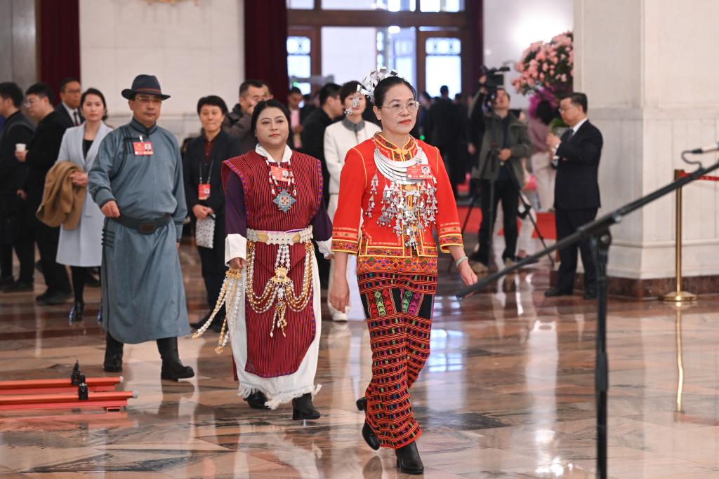 3月10日,全国政协十四届三次会议第三场“委员通道”集体采访活动在北京人民大会堂举行。这是接受采访的全国政协委员入场。新华社记者 金良快 摄