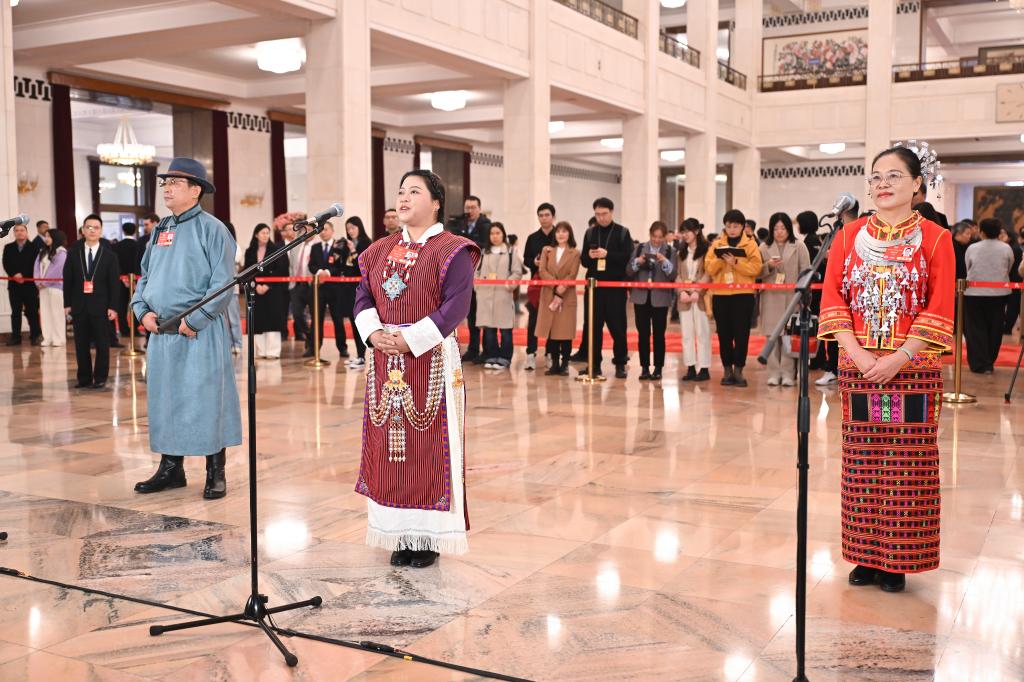 3月10日,全国政协十四届三次会议第三场“委员通道”集体采访活动在北京人民大会堂举行。这是全国政协委员阿拉腾达来接受媒体采访。新华社记者 才扬 摄