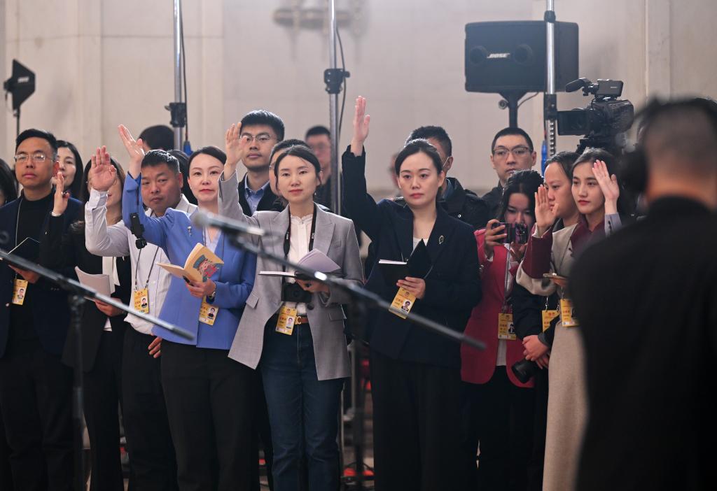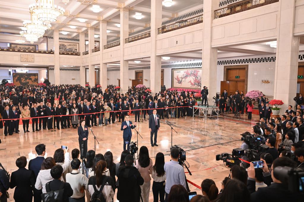 3月10日,全国政协十四届三次会议第三场“委员通道”集体采访活动在北京人民大会堂举行。这是新华社记者在提问。新华社记者 金良快 摄
