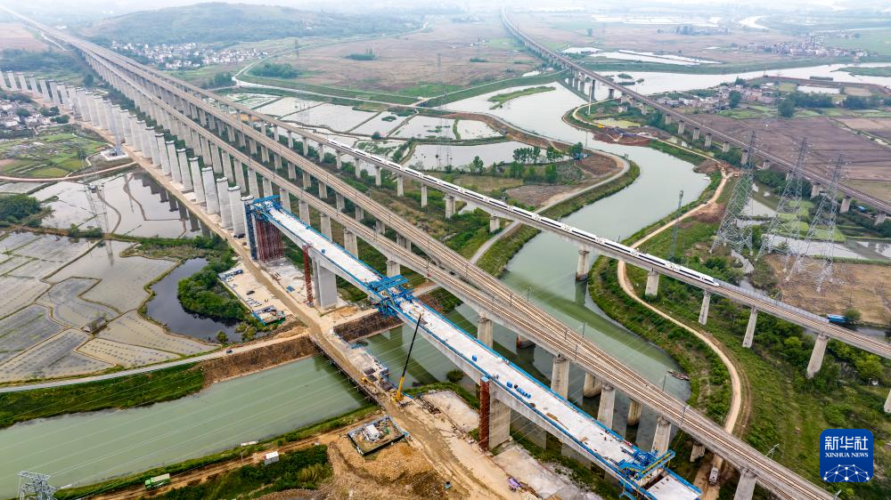 这是中铁四局巢马城际铁路跨清溪河特大桥连续梁施工现场(4月24日摄,无人机照片)。新华社发(刘玉才摄)