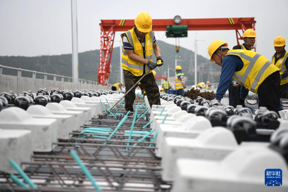 4月24日,在安徽省马鞍山市含山县,中铁四局施工人员在进行巢马城际铁路无砟轨道板铺设施工。新华社记者 刘军喜 摄