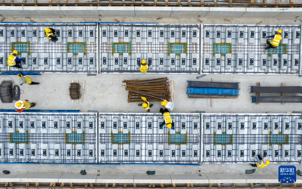4月24日,在安徽省马鞍山市含山县,中铁四局施工人员在进行巢马城际铁路无砟轨道板铺设施工(无人机照片)。新华社发(刘玉才摄)