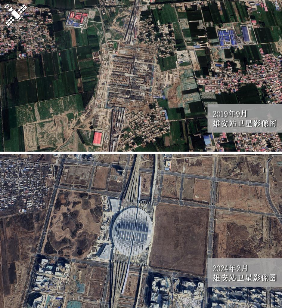 解读:2019年9月建设前期(上图)对比建成后的2024年2月(下图),雄安站枢纽主体结构拔地而起。