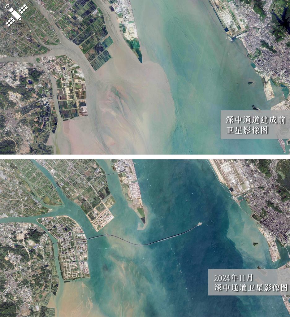 解读:建设前影像(上图)对比正式通车后的2024年11月(下图),深中通道主体结构横贯江面。