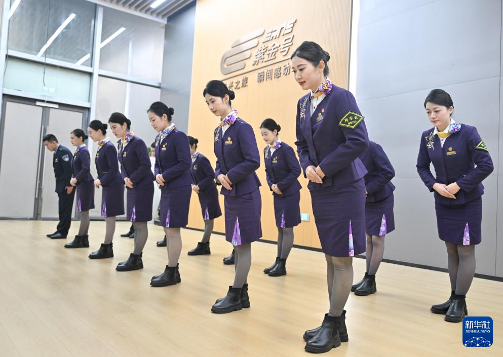 1月28日,中国铁路武汉局集团有限公司武汉客运段D38次列车的列车员进行服务礼仪培训。新华社发(赵军摄)