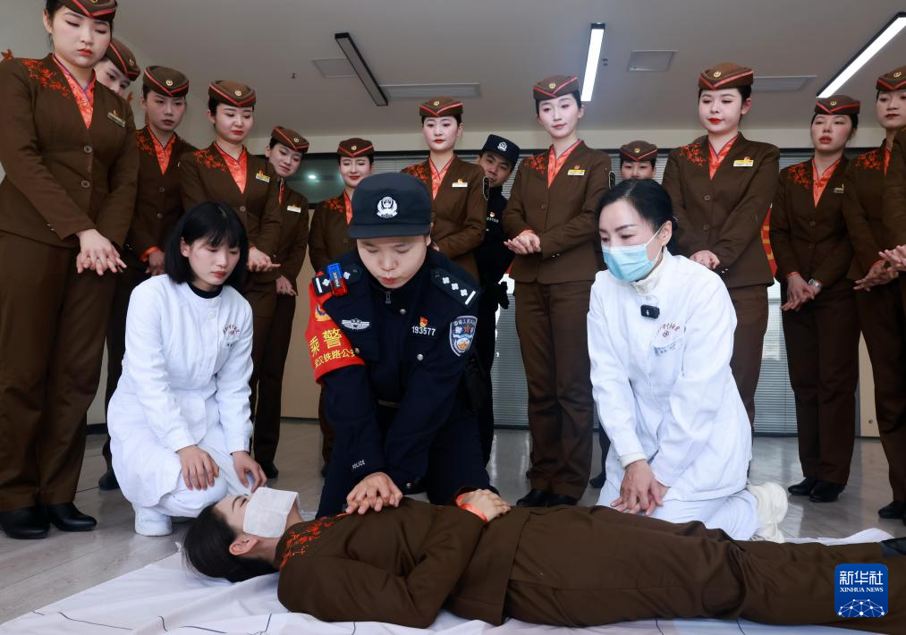 1月28日,武汉铁路公安处江城女子乘警队乘警在中南医院医护人员指导下进行心肺复苏培训。新华社发(赵军摄)
