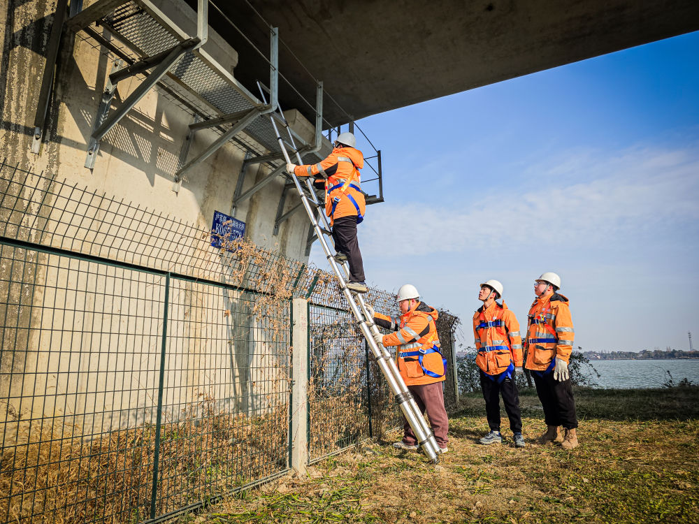 春运期间,上海高铁基础设施段湖州车间桥梁组工作人员在沪苏湖高铁元荡湖段进行检修作业。