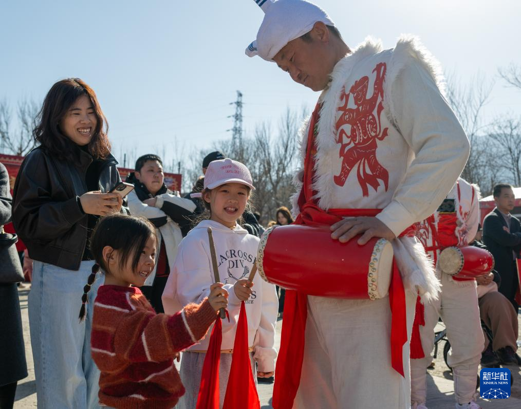 2月19日,在北京市海淀区凤凰岭第十三届新春非遗游园会上,小朋友与演出人员互动。新华社记者 胡竞文 摄