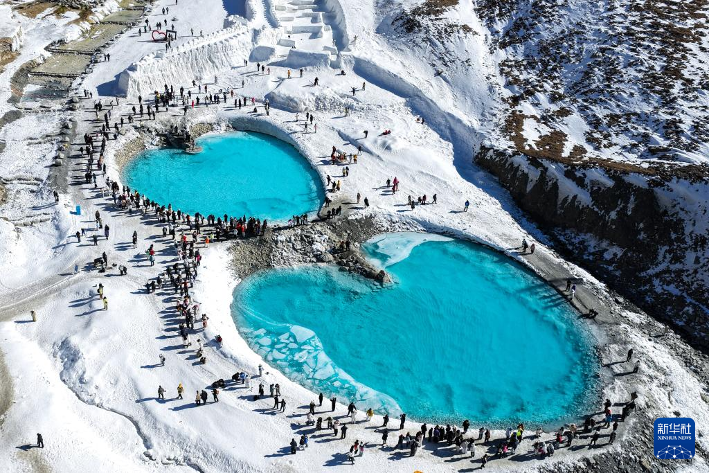 2月20日,游客在位于青海省海北藏族自治州门源回族自治县的岗什卡雪山游玩(无人机照片)。新华社记者 张龙 摄