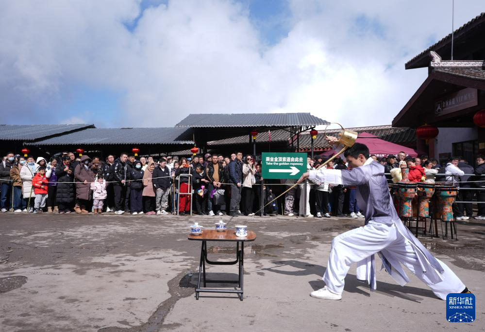 2月20日,在四川峨眉山景区的金顶索道排队处,四川峨眉山景区组织茶艺表演。新华社记者 江宏景 摄