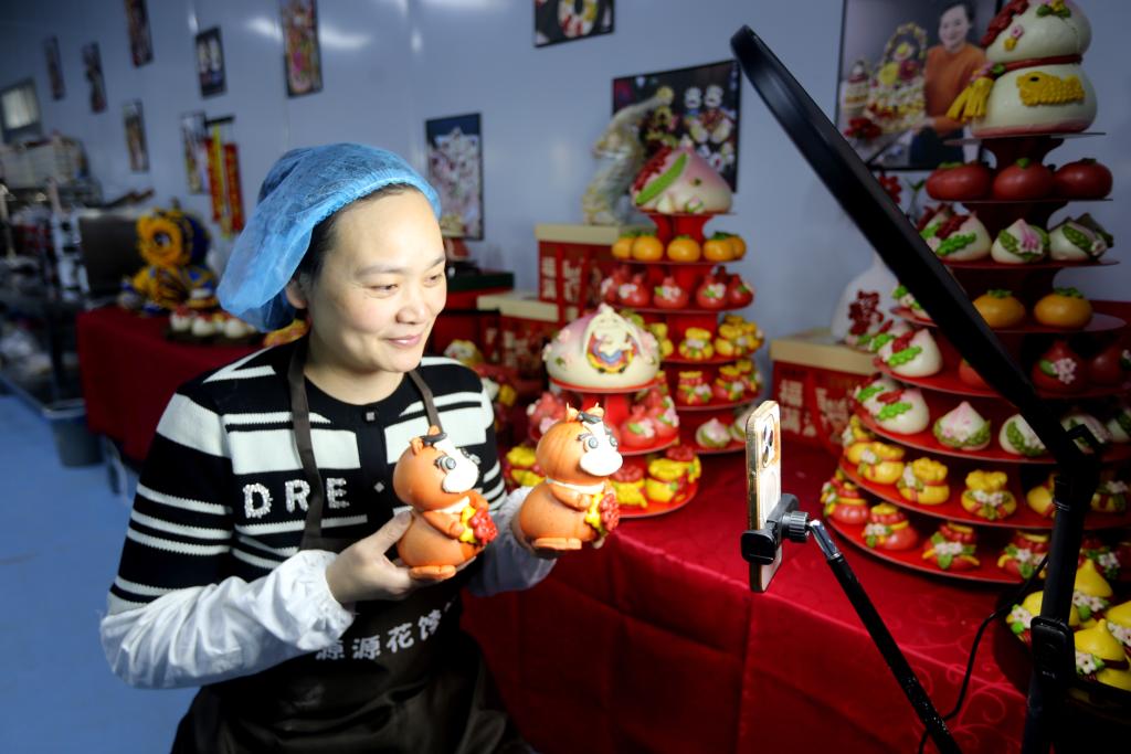 1月28日,江苏省连云港市一家花饽饽工作坊的员工在网上直播销售新春花馍。新华社发(王春 摄)