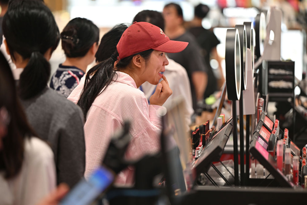 2026年2月16日,顾客在海南海口日月广场免税店选购美妆产品。