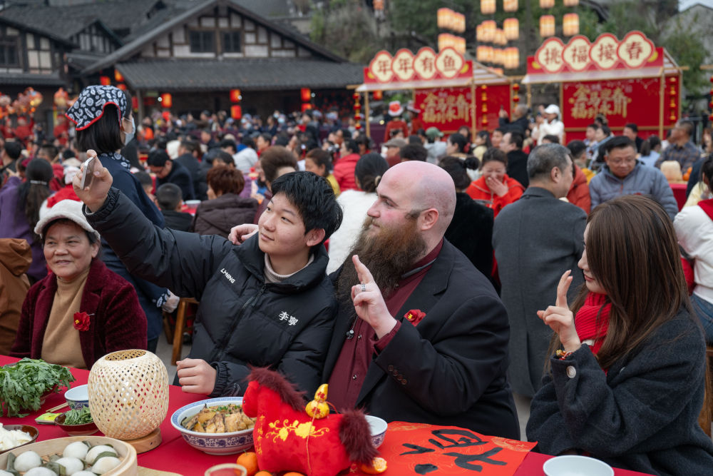 2026年2月16日,外国游客在重庆永川松溉古镇除夕夜千家宴现场与当地居民游客并排而坐,开心过年。