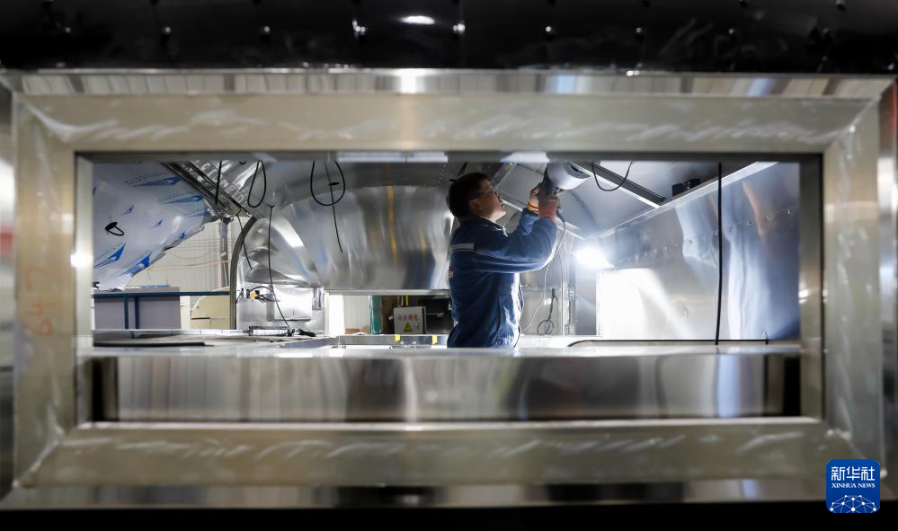 2月24日,在河南省武陟经济技术开发区的河南威百特智能装备有限公司生产车间,工人在生产中置轴餐车。新华社发(王琳锋摄)
