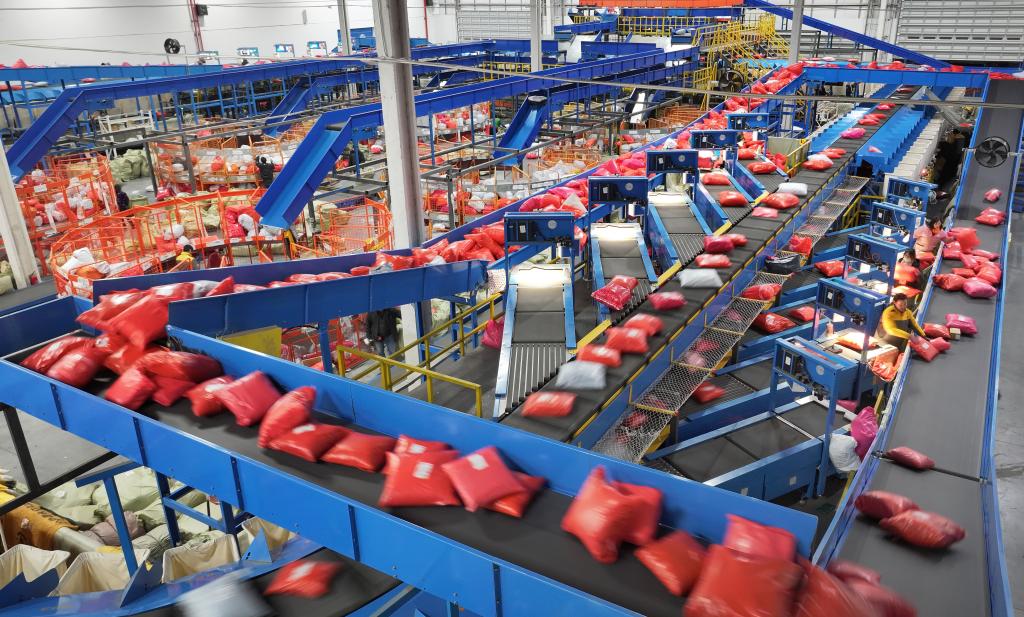 在江苏南通一家国际物流园分拣中心,工作人员在分拣货物(2023年12月20日摄,无人机照片)。“十四五”期间,面对地缘政治风险和贸易壁垒,我国以跨境电商、保税维修、市场采购等为代表的新业态新模式助力各国消费者、生产者“买全球、卖全球”,成为稳外贸的重要引擎。