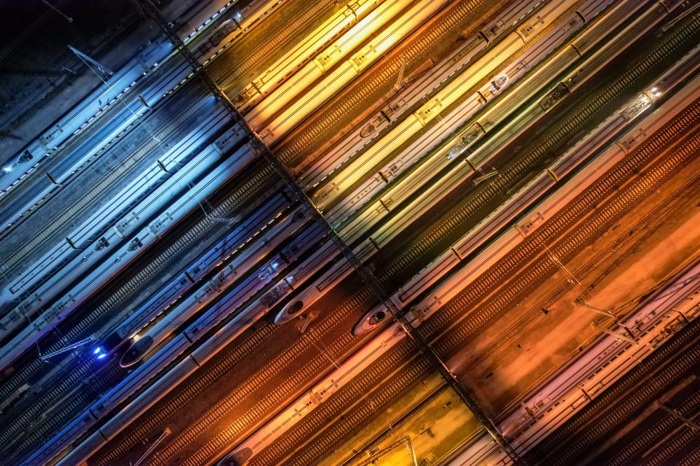 动车组列车停靠在贵阳北动车所内(2023年1月6日摄,无人机照片)。“十四五”期间,我国建成世界规模最大、先进发达的高速铁路网。
