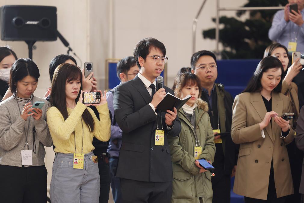 3月4日,全国政协十四届四次会议首场“委员通道”集体采访活动在北京人民大会堂举行。这是记者在提问。新华社记者 卢烨 摄