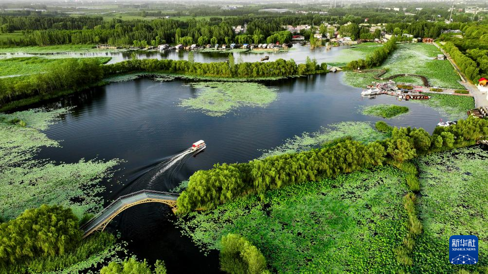 这是山东省济宁市微山县微山湖二级坝湿地公园景色(2024年8月13日摄,无人机照片)。新华社记者 郭绪雷 摄