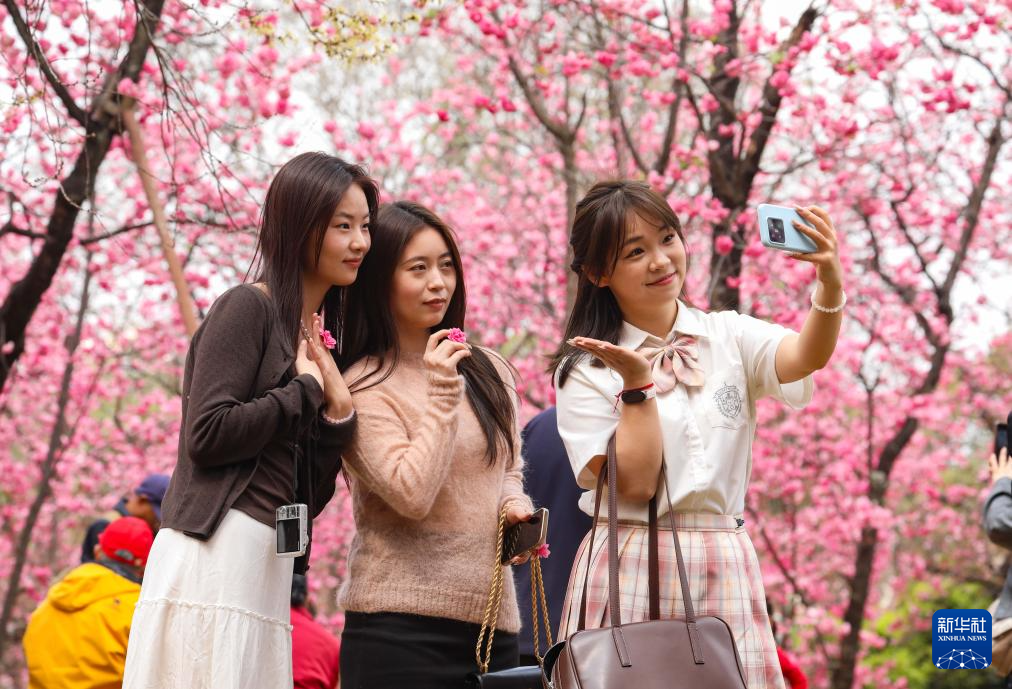 3月8日,游客在江苏省南京市朝天宫景区赏花拍照。新华社发(刘建华摄)