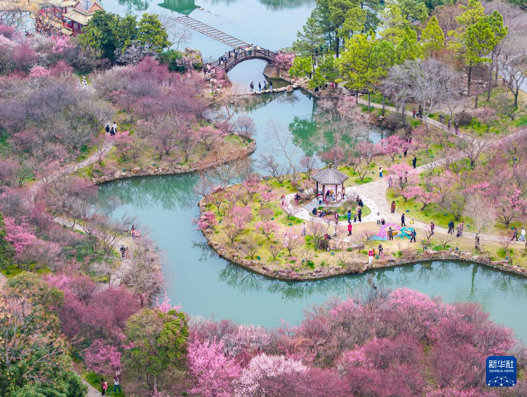 3月7日,游客在南京中山植物园赏樱游玩(无人机照片)。新华社发(史俊摄)