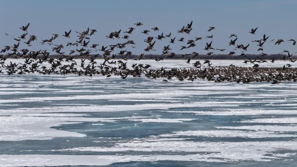 3月9日,在位于黑龙江省鸡西市的兴凯湖国家级自然保护区,一群豆雁在冰面上起飞。新华社发(孙海淇摄)