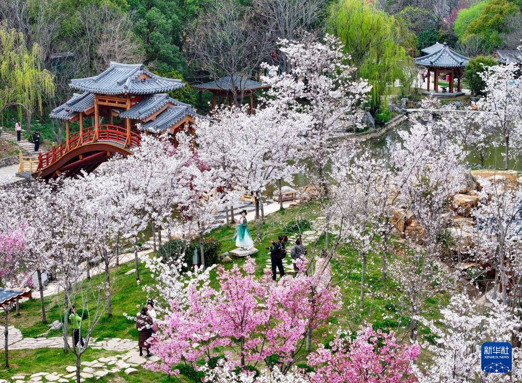 3月22日,游人在湖北省襄阳市盛世唐城景区樱花园内赏花游玩(无人机照片)。新华社发(杨东摄)