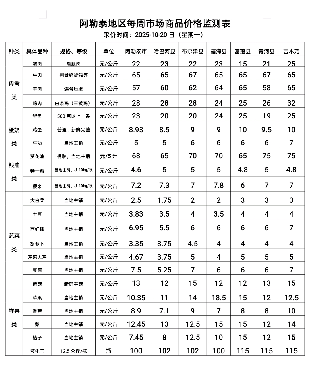 阿勒泰地区每周市场商品价格监测表