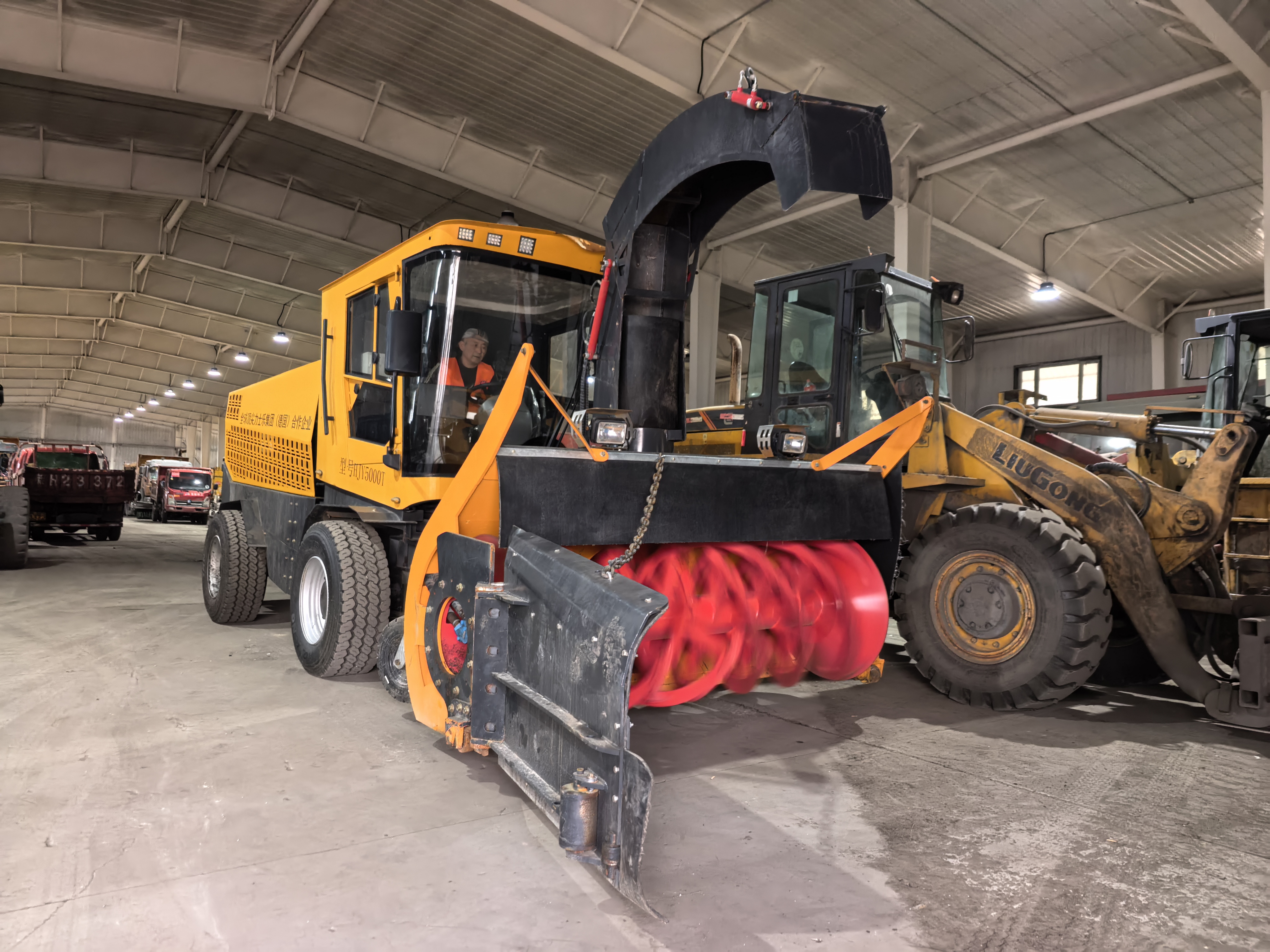 机械厂内,抛雪机整装待发应对降雪。