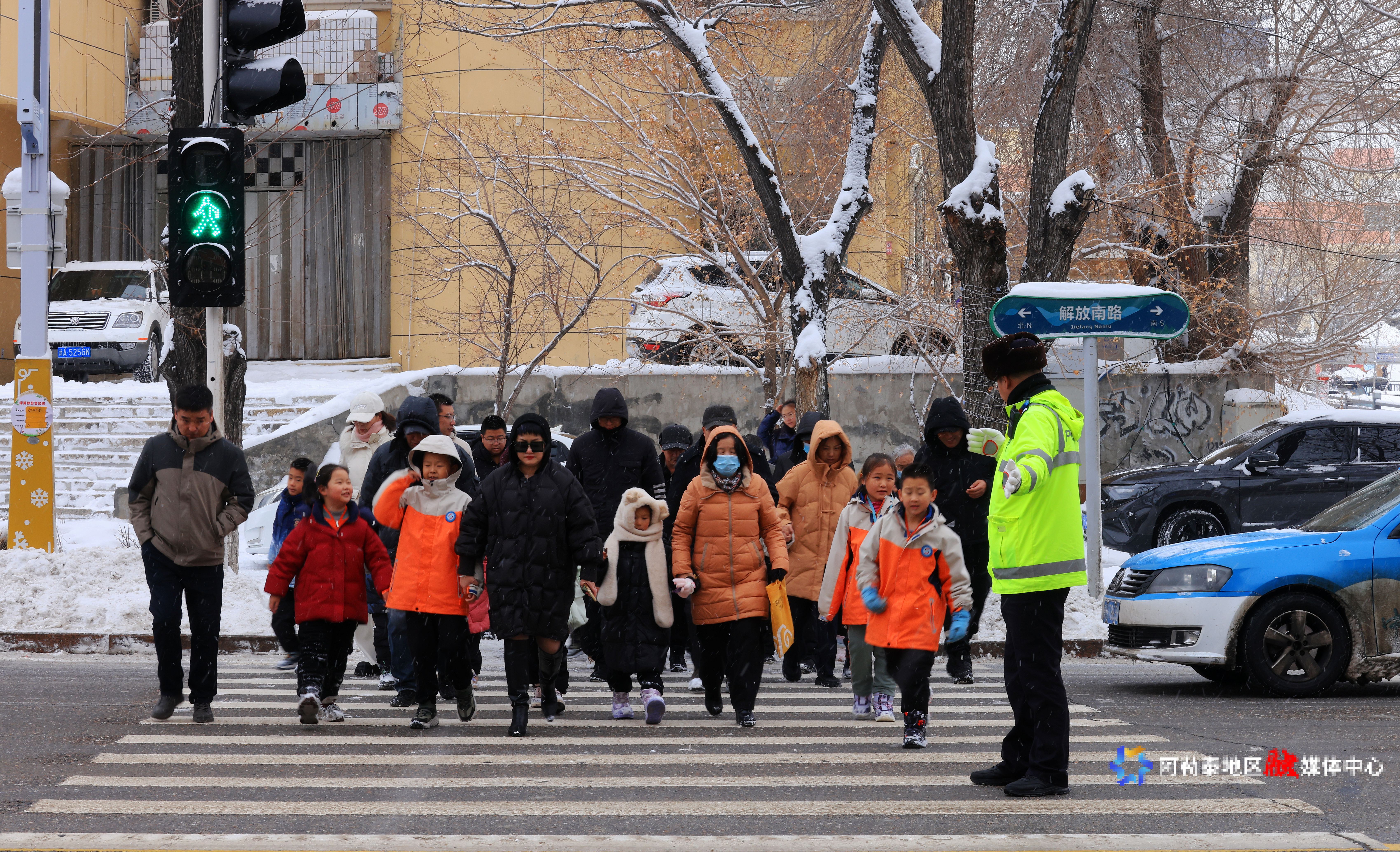 12月16日,阿勒泰市公安局民警在各学校十字路口疏导交通。
