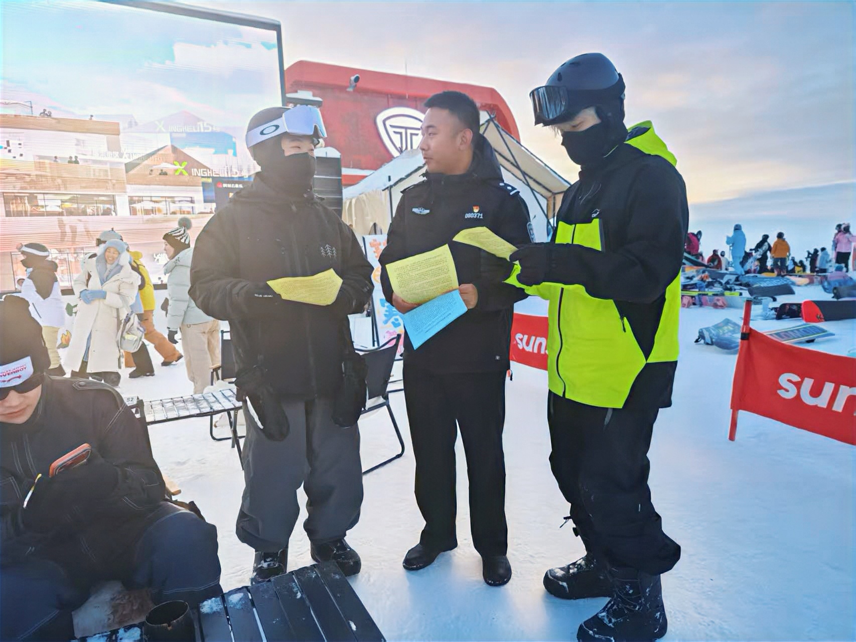 阿勒泰市公安局解放路街道派出所民警在阿勒泰将军山国际滑雪度假区开展精准反诈宣传。