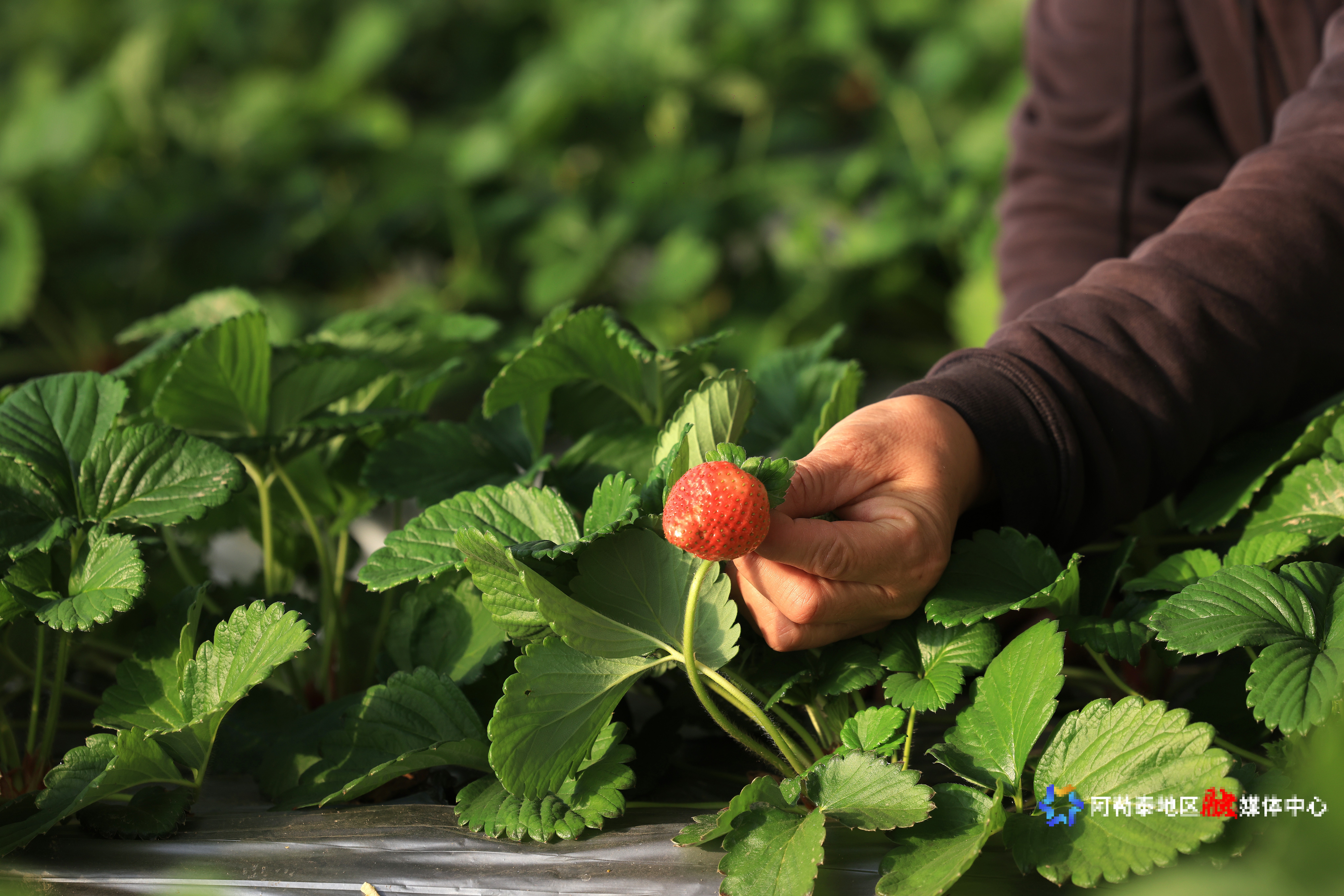 1月5日,阿勒泰市拉斯特农业大棚内,工人们展示成熟的草莓。