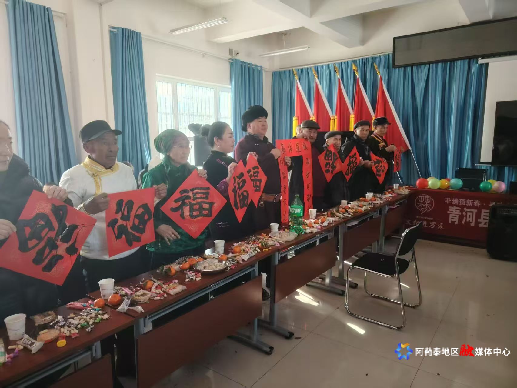 广大居民群众手捧福字。青河县文化馆供图