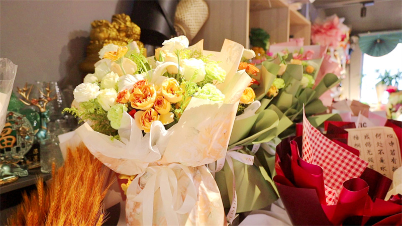 包装精美的节日花束陈列店内,静待顾客选购。