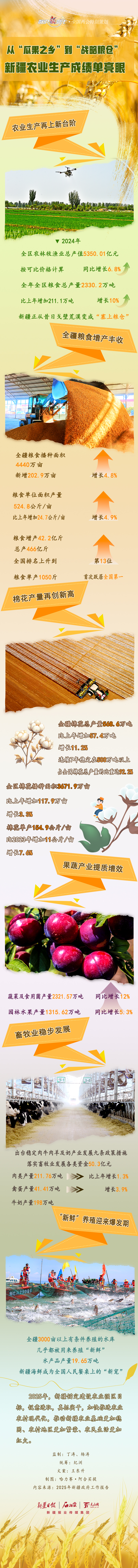 2024年,天山南北年丰时稔、金谷满仓。这一年,新疆聚焦打造全国优质农牧产品重要供给基地,全区农业农村发展稳中向好、稳中提质。2024年,新疆农业生产取得了哪些成绩?一起来看看。