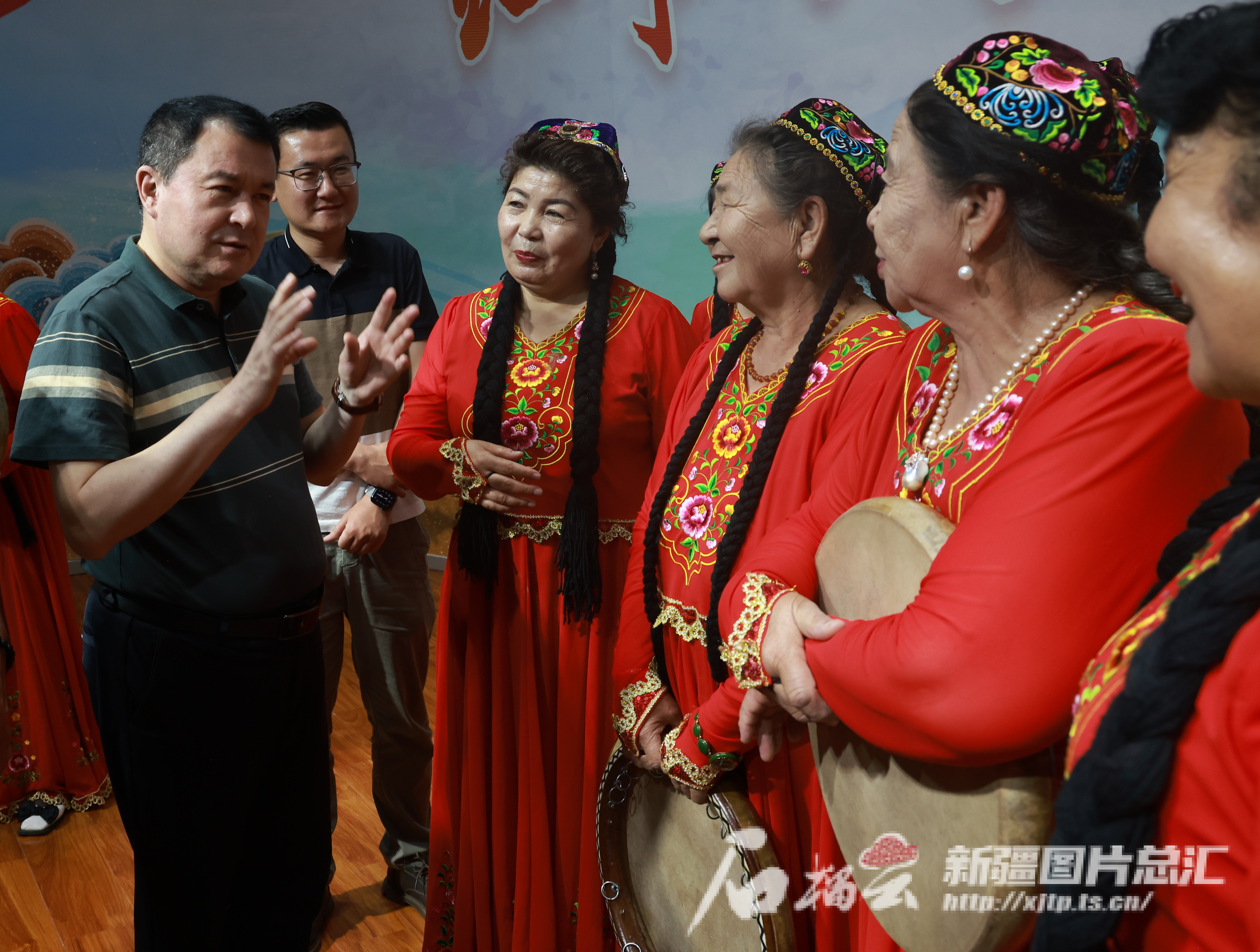 2024年3月,地力下提·帕尔哈提(左一)在哈密市伊吾县调研民间木卡姆班社时同民间艺人交流。迪丽夏提·伊不拉伊木摄