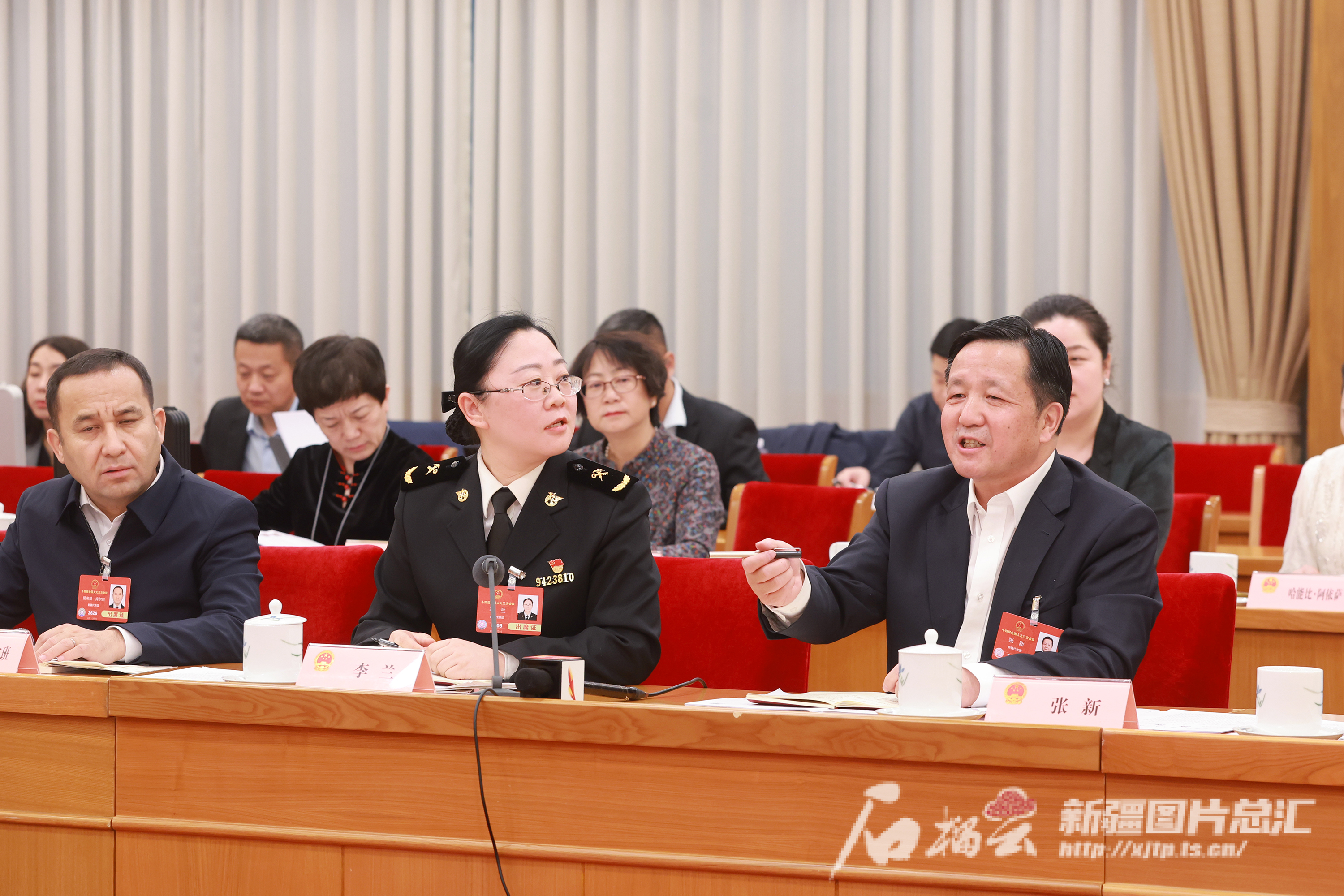 3月7日,参加十四届全国人大三次会议的新疆代表团审议全国人民代表大会和地方各级人民代表大会代表法修正草案。这是审议时张新代表(前右)围绕促进代表积极履职、企业积极参与“一带一路”建设等内容发言。 天山网-新疆日报记者 崔志坚摄