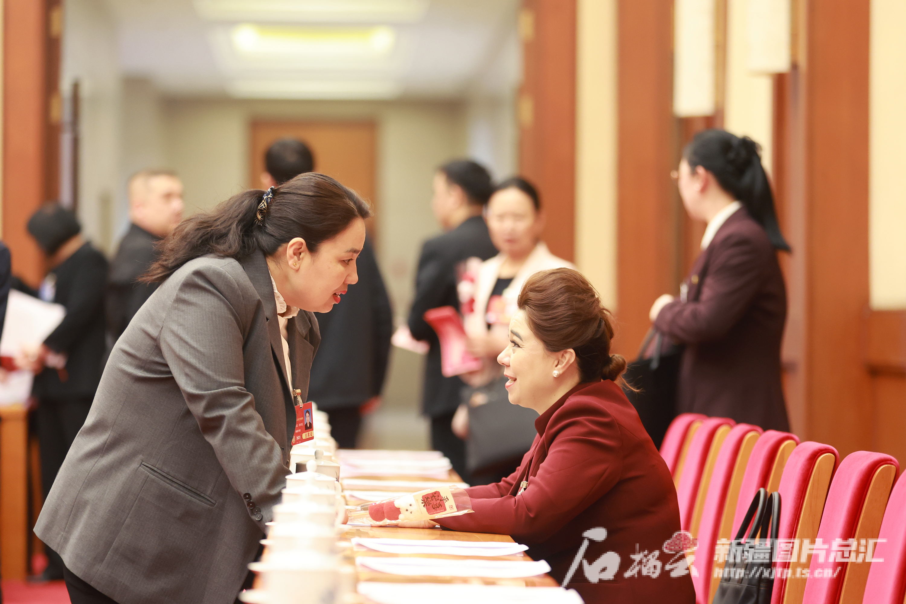 3月8日,参加十四届全国人大三次会议的新疆代表团审议全国人大常委会工作报告。这是会前,偌尔布亚·斯依提代表(左)和再依努热·塔里哈提代表在交流。天山网-新疆日报记者 崔志坚摄