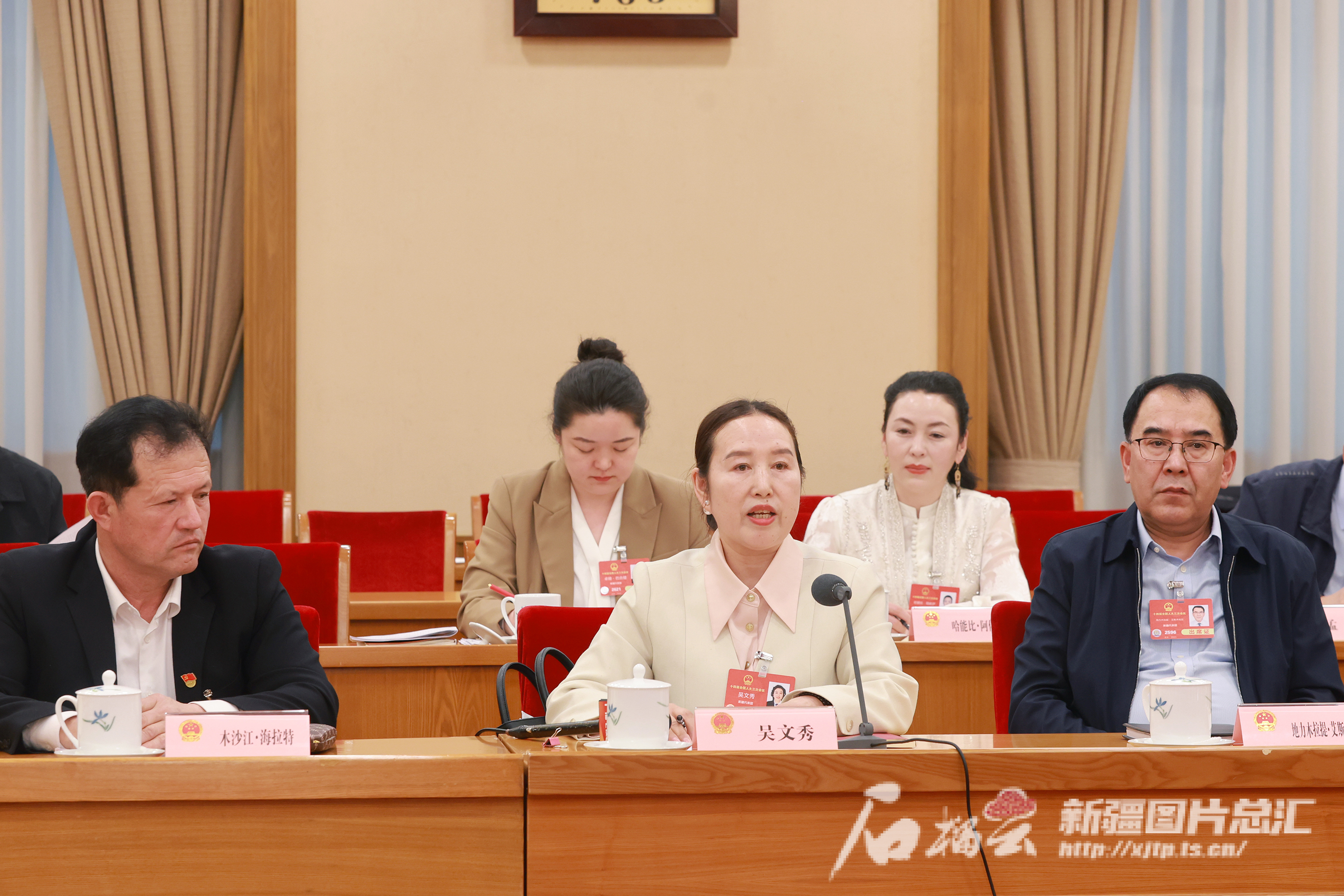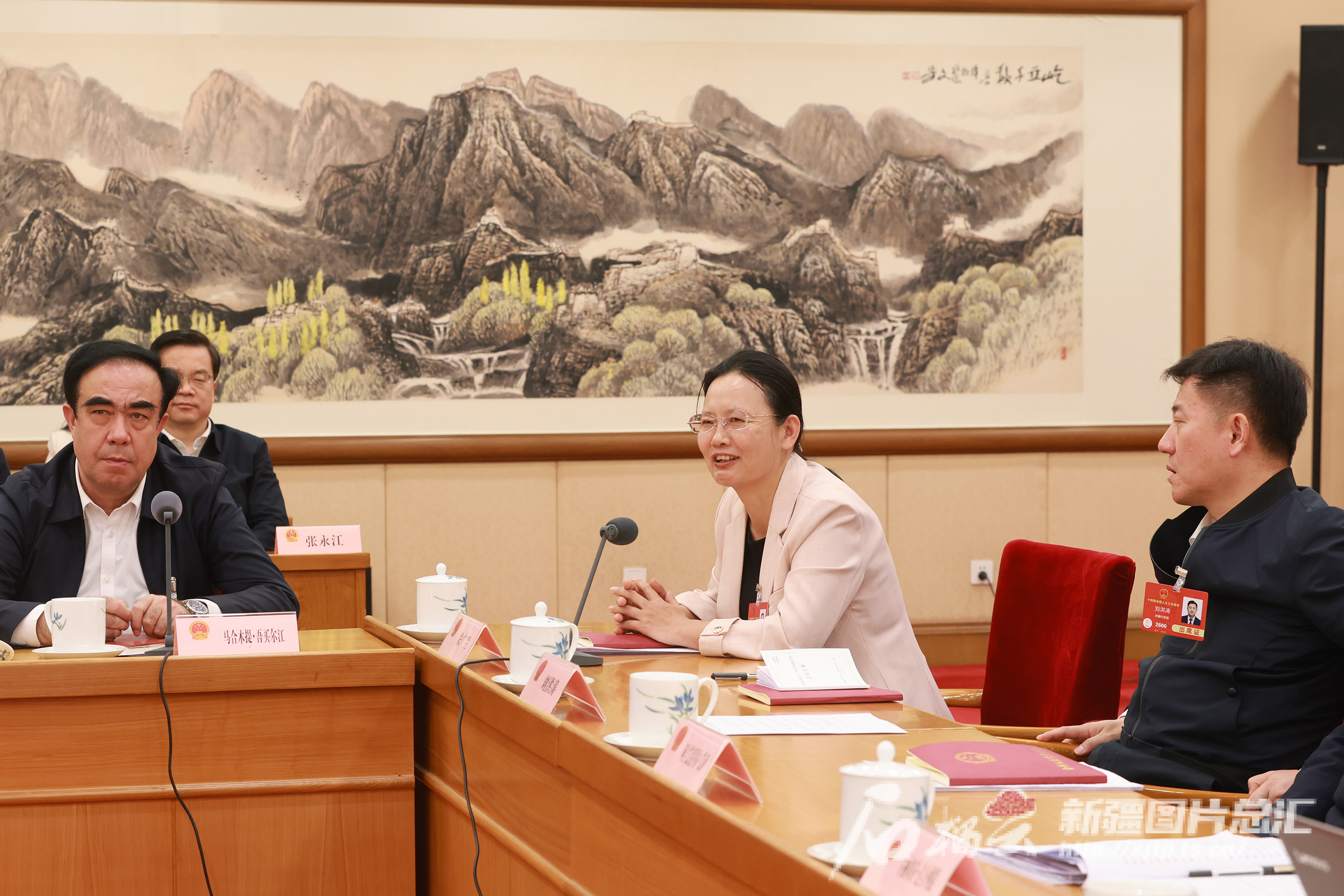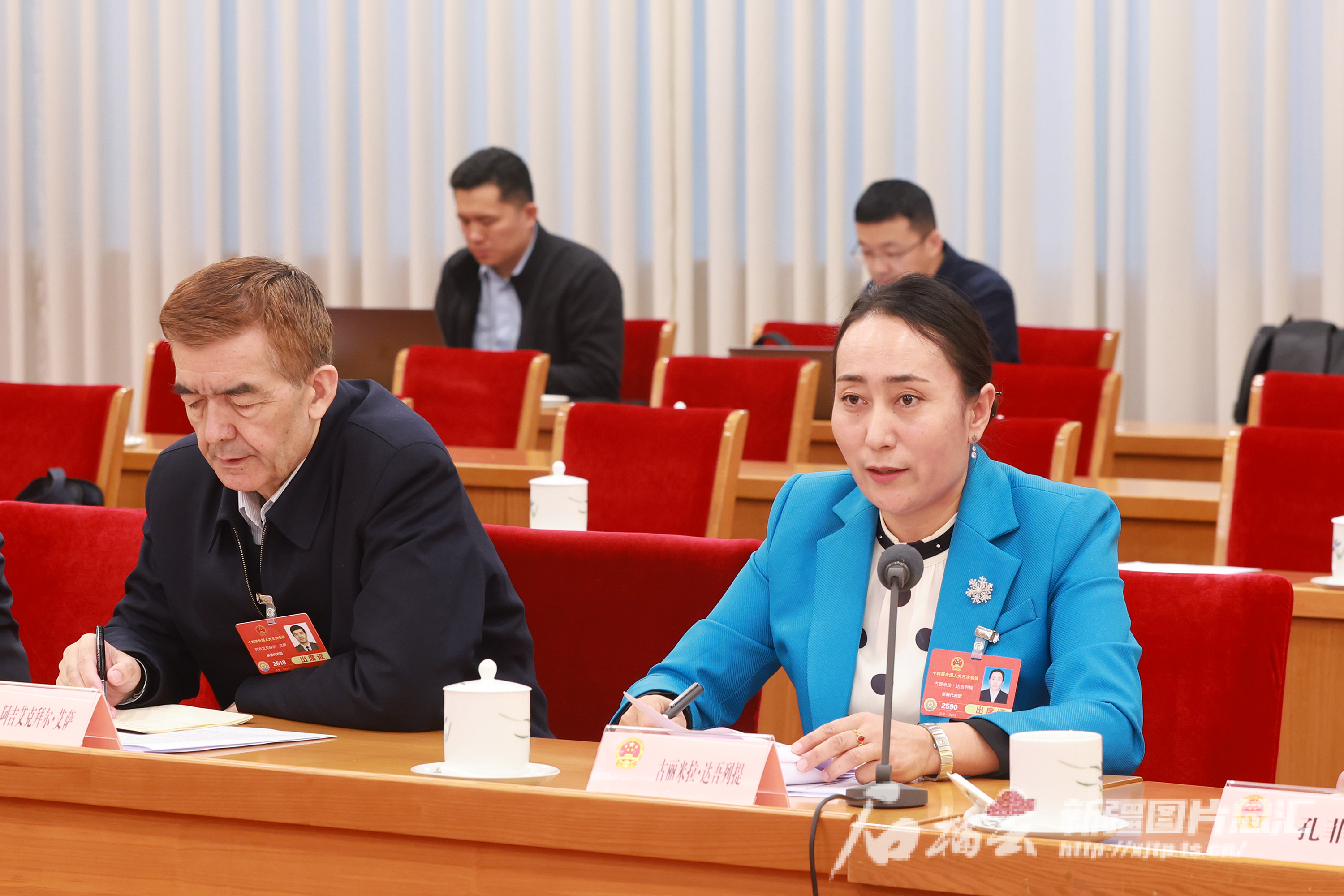 3月8日,参加十四届全国人大三次会议的新疆代表团审议全国人大常委会工作报告。古丽米拉·达吾列提代表(前右)围绕持续推动边境口岸高水平开放等内容发言。天山网-新疆日报记者 崔志坚摄