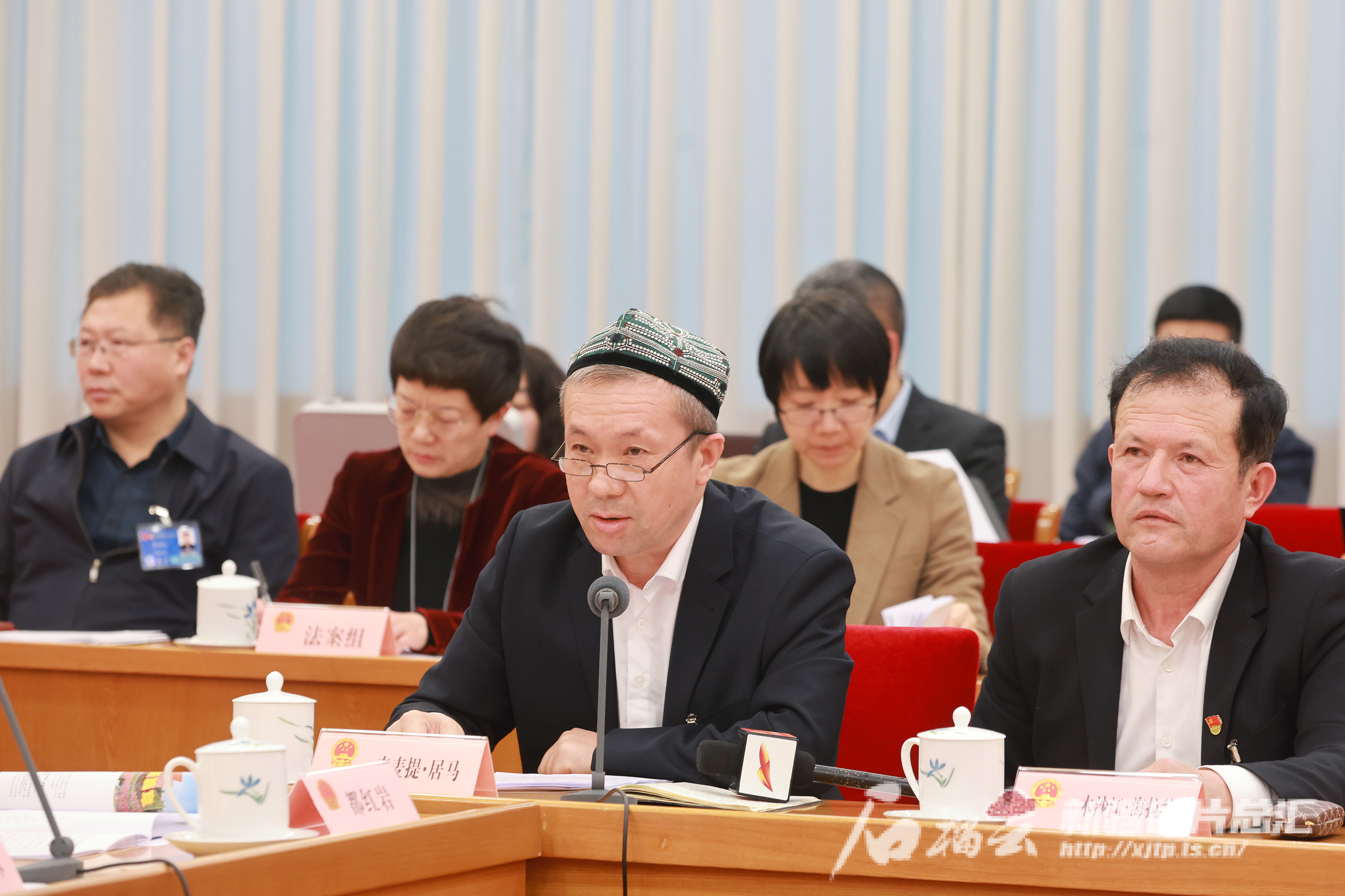 3月8日,参加十四届全国人大三次会议的新疆代表团审议全国人大常委会工作报告。麦麦提·居马代表(前左)围绕不断增强各族群众“五个认同” 等内容发言。天山网-新疆日报记者 崔志坚摄
