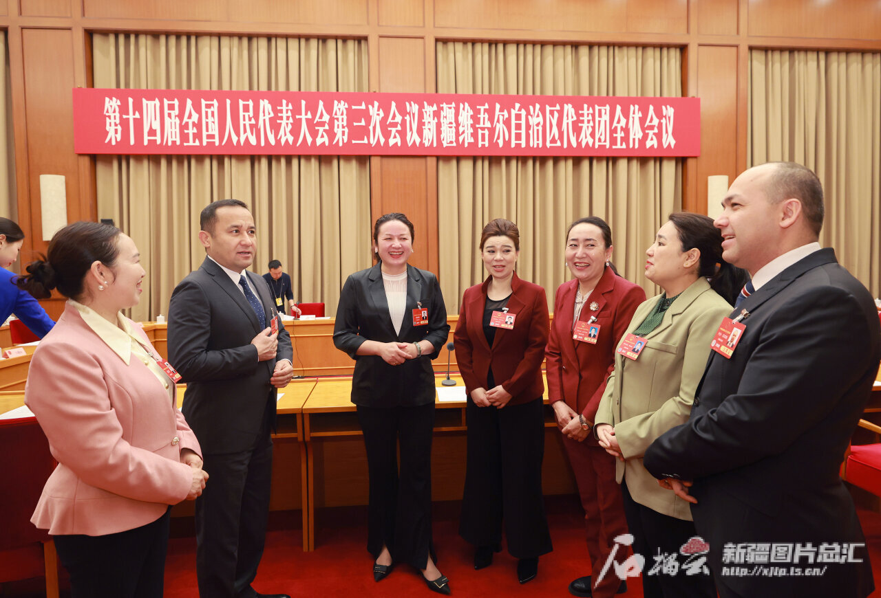 3月10日上午,参加十四届全国人大三次会议的新疆代表团审议全国人大常委会工作报告、最高人民法院工作报告、最高人民检察院工作报告。这是会前,几位代表在交流履职心得。天山网-新疆日报记者 崔志坚摄
