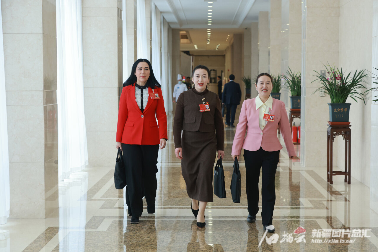 3月10日上午,参加十四届全国人大三次会议的新疆代表团审议全国人大常委会工作报告、最高人民法院工作报告、最高人民检察院工作报告。这是米娜瓦尔·艾比布拉代表(左)、哈能比·阿依萨代表(中)、吴文秀代表在前往会场的途中。天山网-新疆日报记者 崔志坚摄