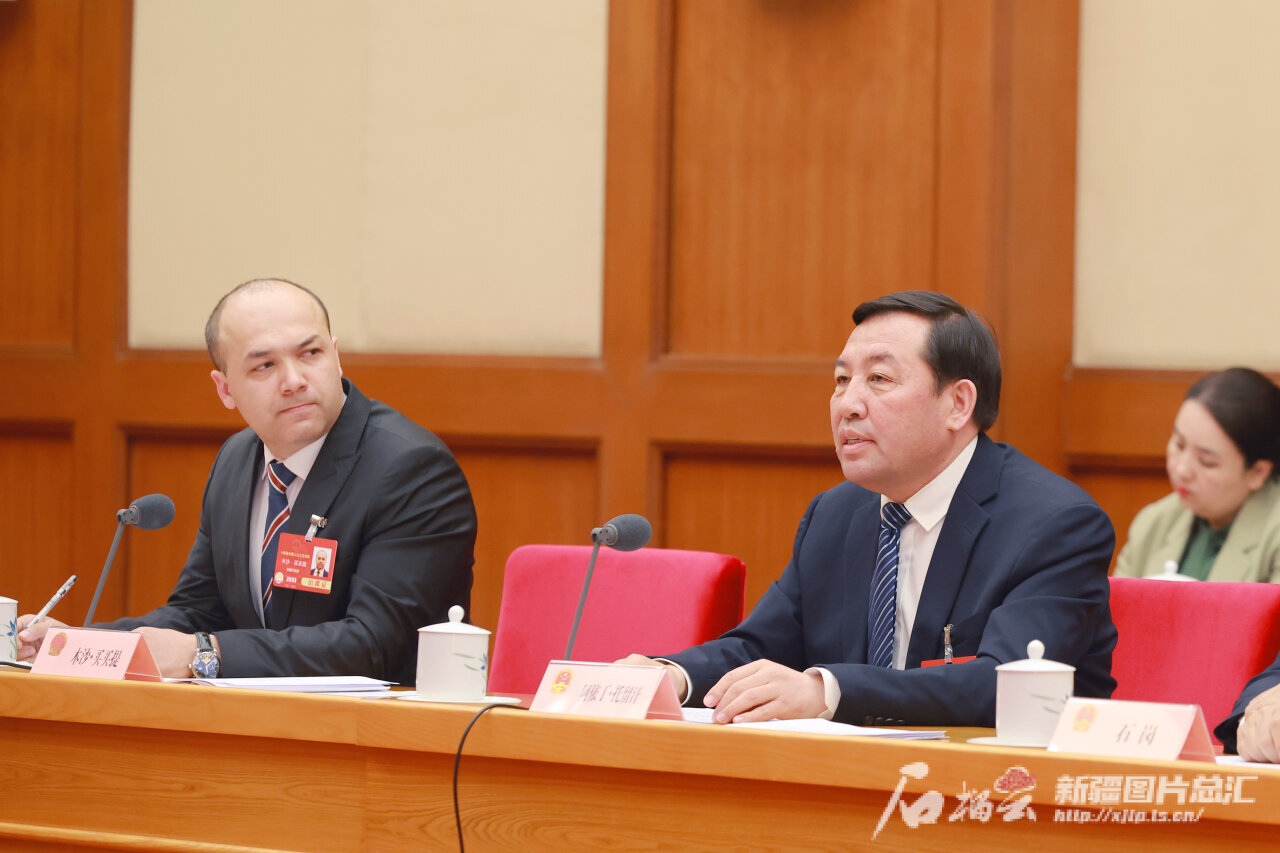 3月10日上午,参加十四届全国人大三次会议的新疆代表团审议全国人大常委会工作报告、最高人民法院工作报告、最高人民检察院工作报告。这是阿依丁·托留汗代表(右)在发言时围绕人大代表信息化履职平台建设等内容发言。天山网-新疆日报记者 崔志坚摄
