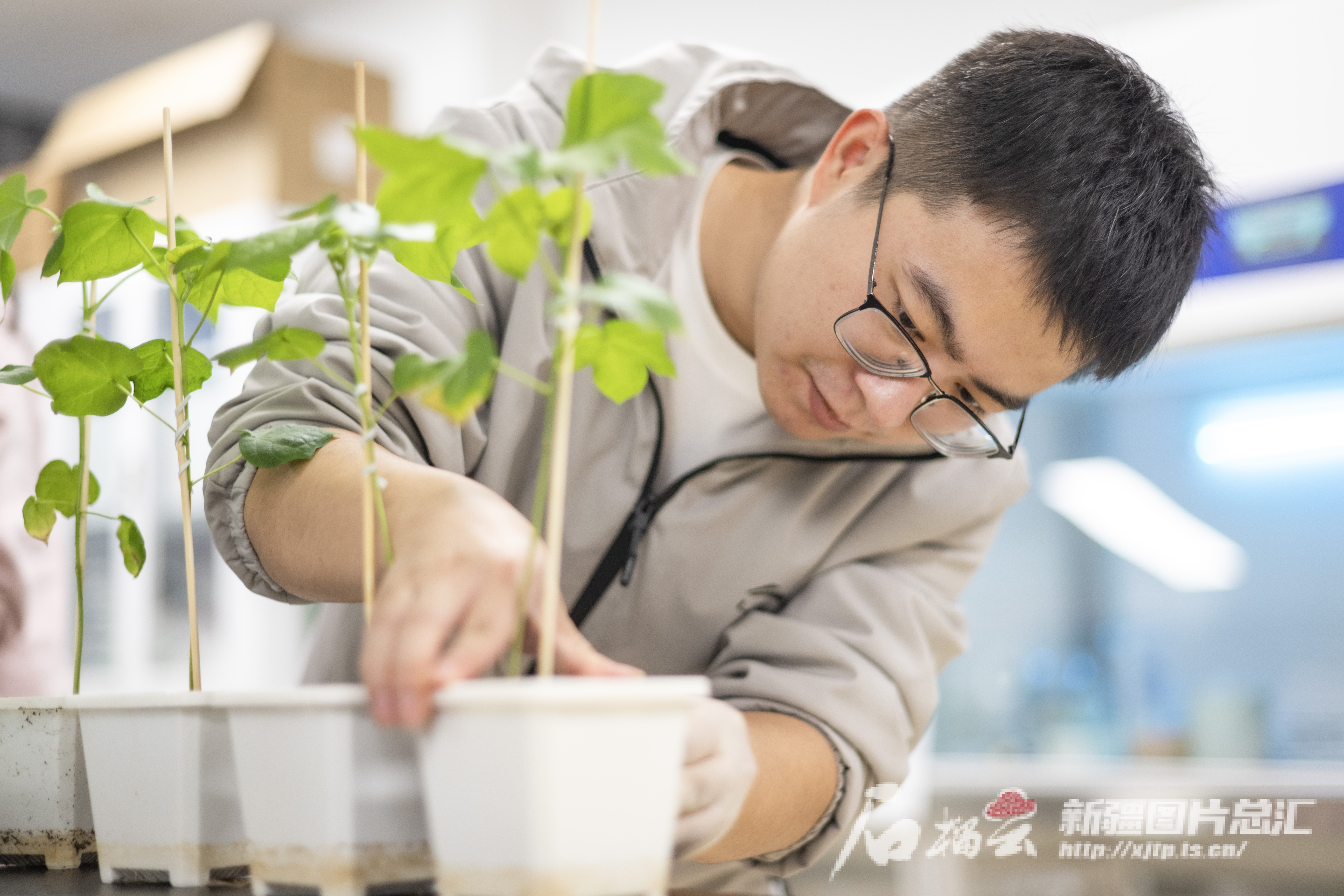 3月27日,在昌吉国家农业高新技术产业示范区中国农业科学院西部农业研究中心,研究员在观察基因编辑棉花品种植株的长势。何龙摄